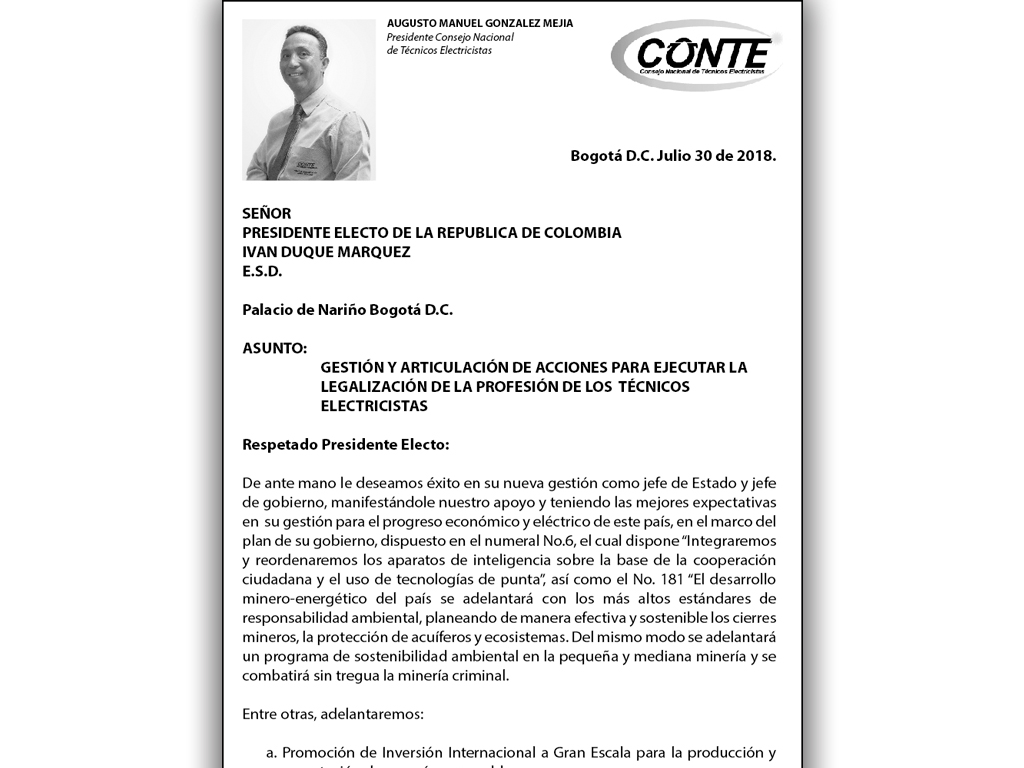 El día domingo 05 de agosto de 2018 se publica en el periódico El Tiempo una carta dirigida al presidente electo de la República de Colombia Iván Duque Márquez por parte del Sr Augusto Manuel González Mejía presidente del Consejo Nacional de Técnicos Electricistas, en la cual se manifiesta las expectativas para la gestión y...Continue Reading