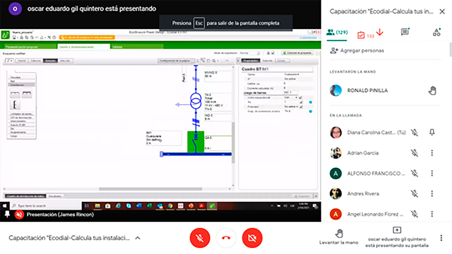 El pasado 10 de febrero se realizó de forma virtual la primera capacitación del año 2021 llevando a cabo el webinar ‘Ecodial – Calcula tus instalaciones eléctricas con facilidad’, el evento estuvo a cargo del capacitador James Rincón, con la participación de más de 130 asistentes, garantizando el compromiso de la actualización tecnológica y exponiendo herramientas de vanguardia a los Técnicos Electricistas en Colombia.